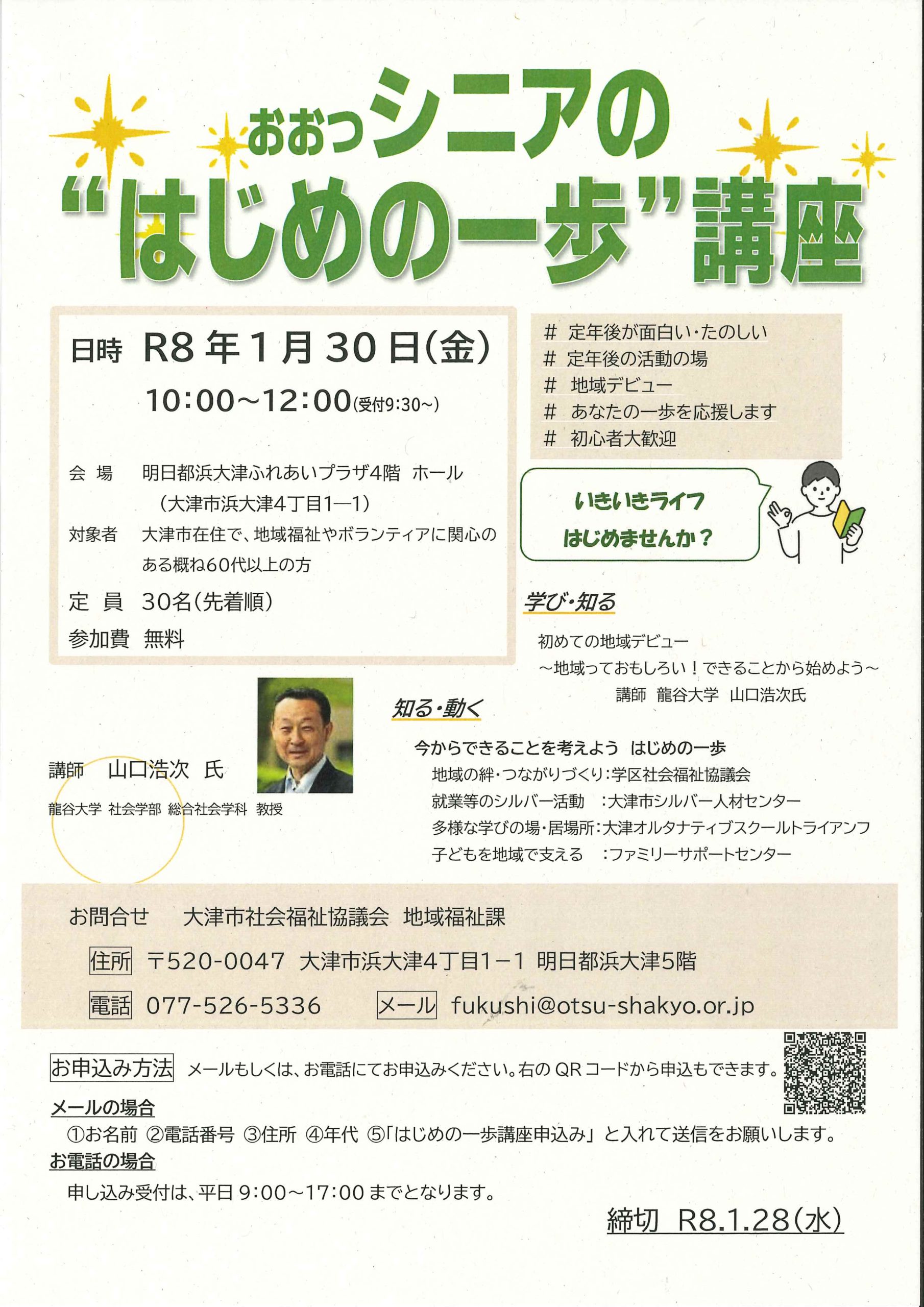 大津市内在住で、地域福祉やボランティアに関心のある概ね60歳以上の方を対象に、地域活動へのデビューを応援する講座を開催します。