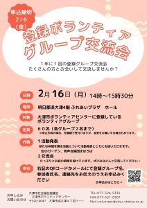 この交流会はボランティアセンターに登録いただいているグループが対象となります。